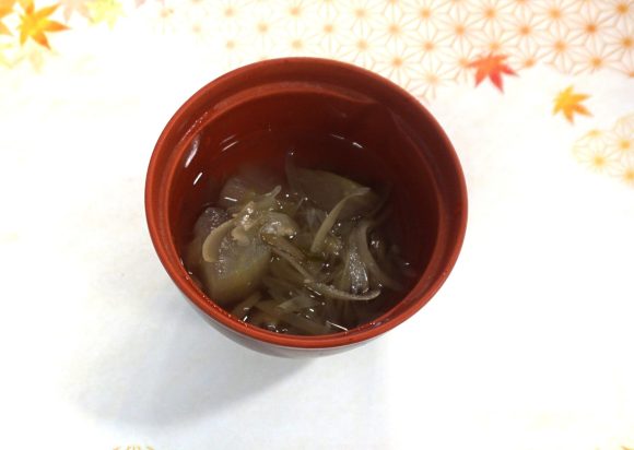 わかめ、手毬麩、三つ葉の入ったすまし汁です。