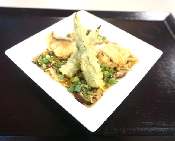 白身魚とオクラの天ぷらと、季節のきのこを使ったあんかけです。