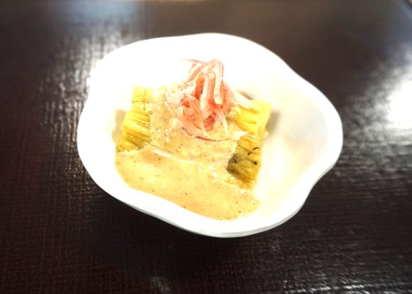 千葉県の名産、葉玉ねぎと旬のうどを使ってぬたを洋風にアレンジしました。