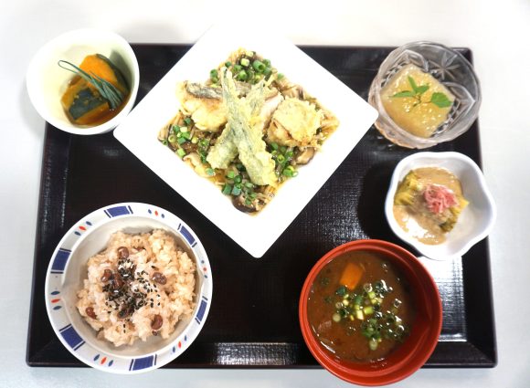 誕生会メニュー 赤飯 天ぷら きのこあんかけ 南瓜の煮物 焼きナスの胡麻酢和え 赤だしの味噌汁 梨のゼリー すだちジュレかけ