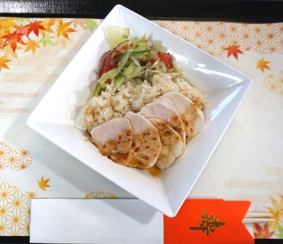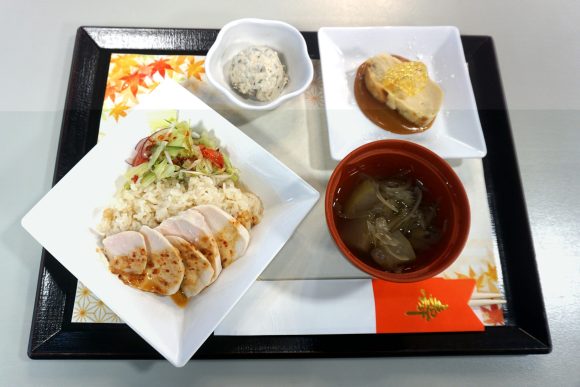 敬老会メニュー タイ風蒸し鶏のせ炊き込みご飯(カオマンガイ風) キノコと里芋のマッシュサラダ 冬瓜のすまし汁 リンゴとバナナのケーキ 塩キャラメルソース