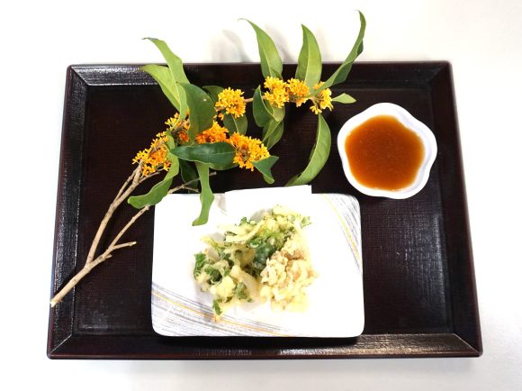 白身魚とオクラの天ぷらと、季節のきのこを使ったあんかけです。