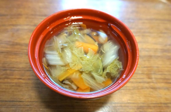 白菜のすまし汁はアクセントに生姜を入れました。