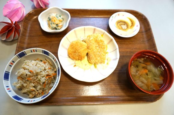 11月誕生会メニュー コロッケ2種 中華風きのこおこわ 柿の白和え 白菜のすまし汁 ロールケーキ