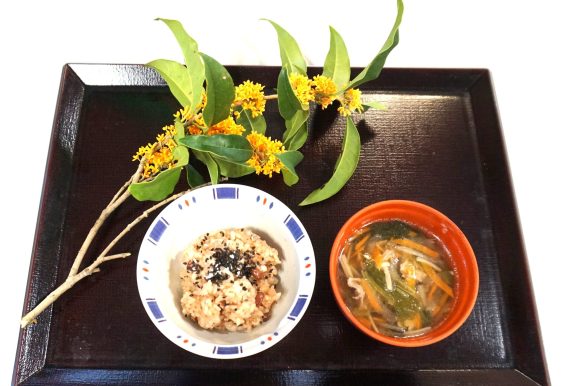 赤飯はもち米とうるち米をブレンドして食べやすくしました。 具だくさんの汁物を添えました。