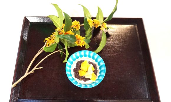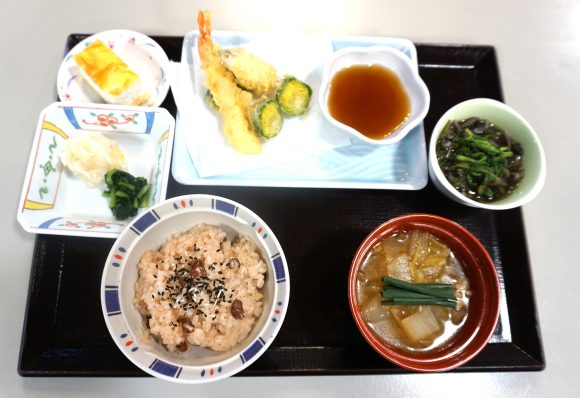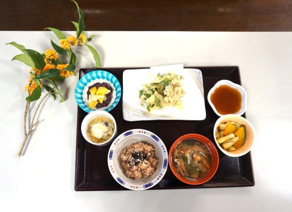 10月誕生会メニュー 野菜の天ぷら 秋のかぶら蒸し 南瓜と茄子の煮びたし 赤飯 沢煮椀 あんみつ