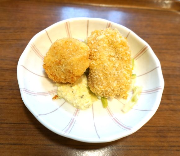 旬の鮭と明太子を芋に混ぜてオレンジ色のコロッケにしました。