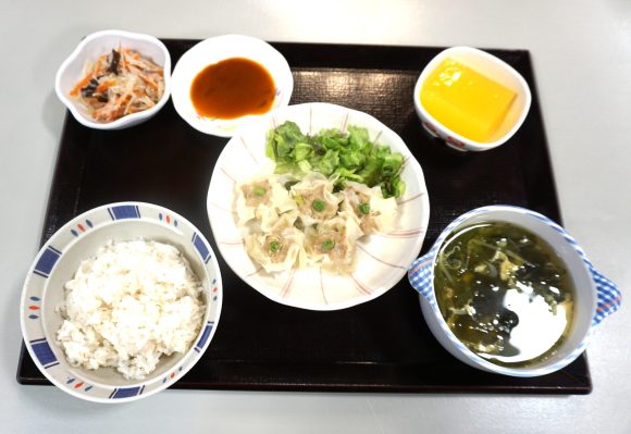 この日のメニュー シュウマイ・春雨サラダ・わかめと卵のスープ・桃ゼリー