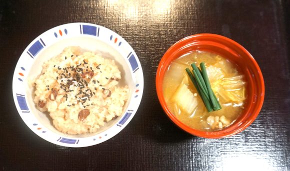 ごはんは入居者さまに人気のお赤飯にしました。 味噌汁は白菜と豚肉で、うま味たっぷりにしました。